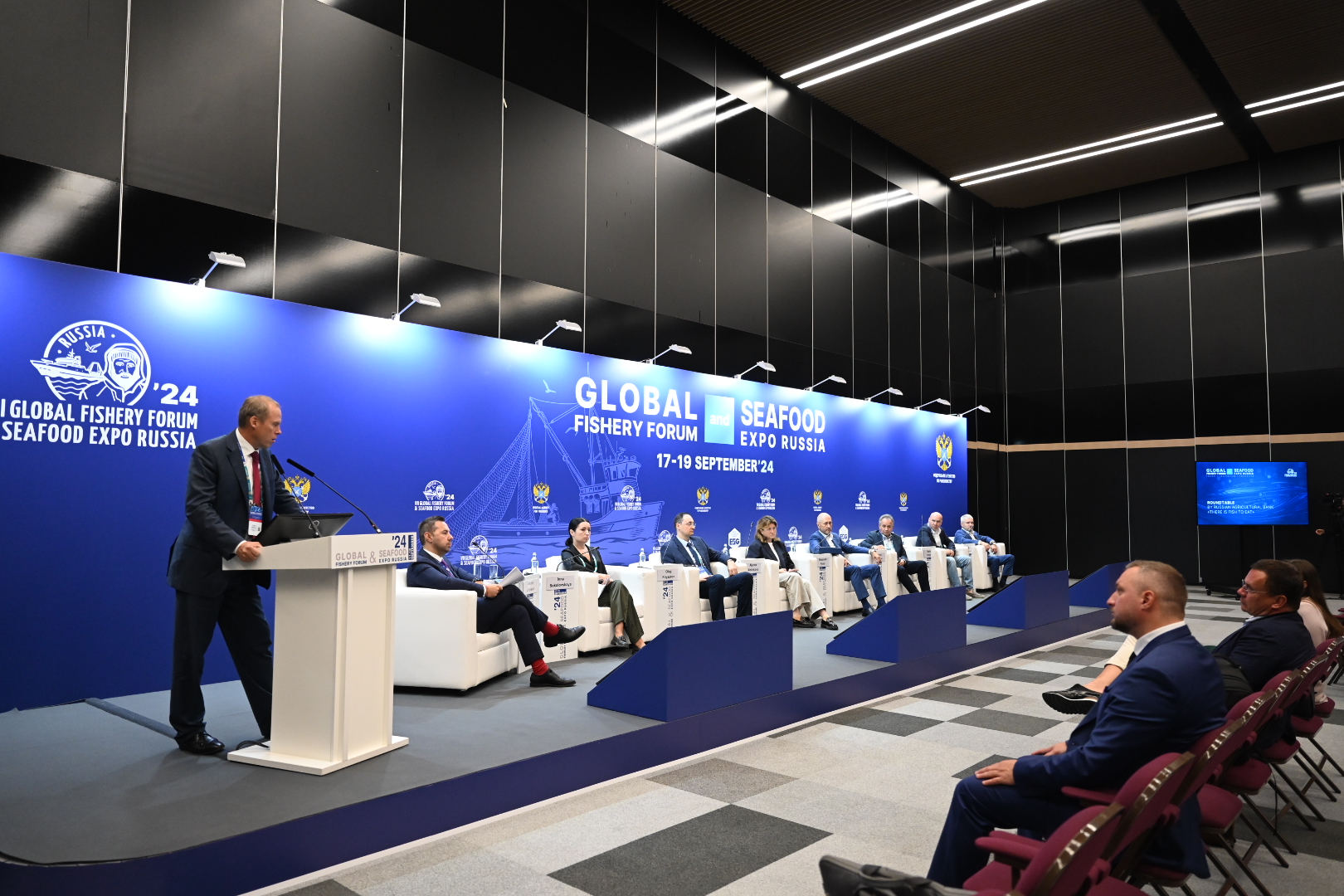 Василий Соколов в приветственном слове рассказал о развитии рыболовной отрасли в России на данный момент. По словам чиновника, рыбной отрасли в России уделяется максимальное внимание. Ключевой вопрос на повестке — это обеспечение внутреннего рынка качественной рыбой и стимуляция потребления рыбы гражданами страны. Для этого правительство утвердило дорожную карту по продвижению рыбы на внутренний рынок, также был принят ряд решений — в том числе были введены инвестквоты на глубокую переработку рыбы, что позволяет получить максимум продукта из каждой тонны выловленной рыбы. Второе ключевое решение, уже показывающее свой эффект — это распространение всех мер поддержки, которые есть в сельском хозяйстве на область аквакультуры. В то же время, в отрасли существует и ряд проблем, которые необходимо решать, в первую очередь импортозависимость по кормам и посадочному материалу.