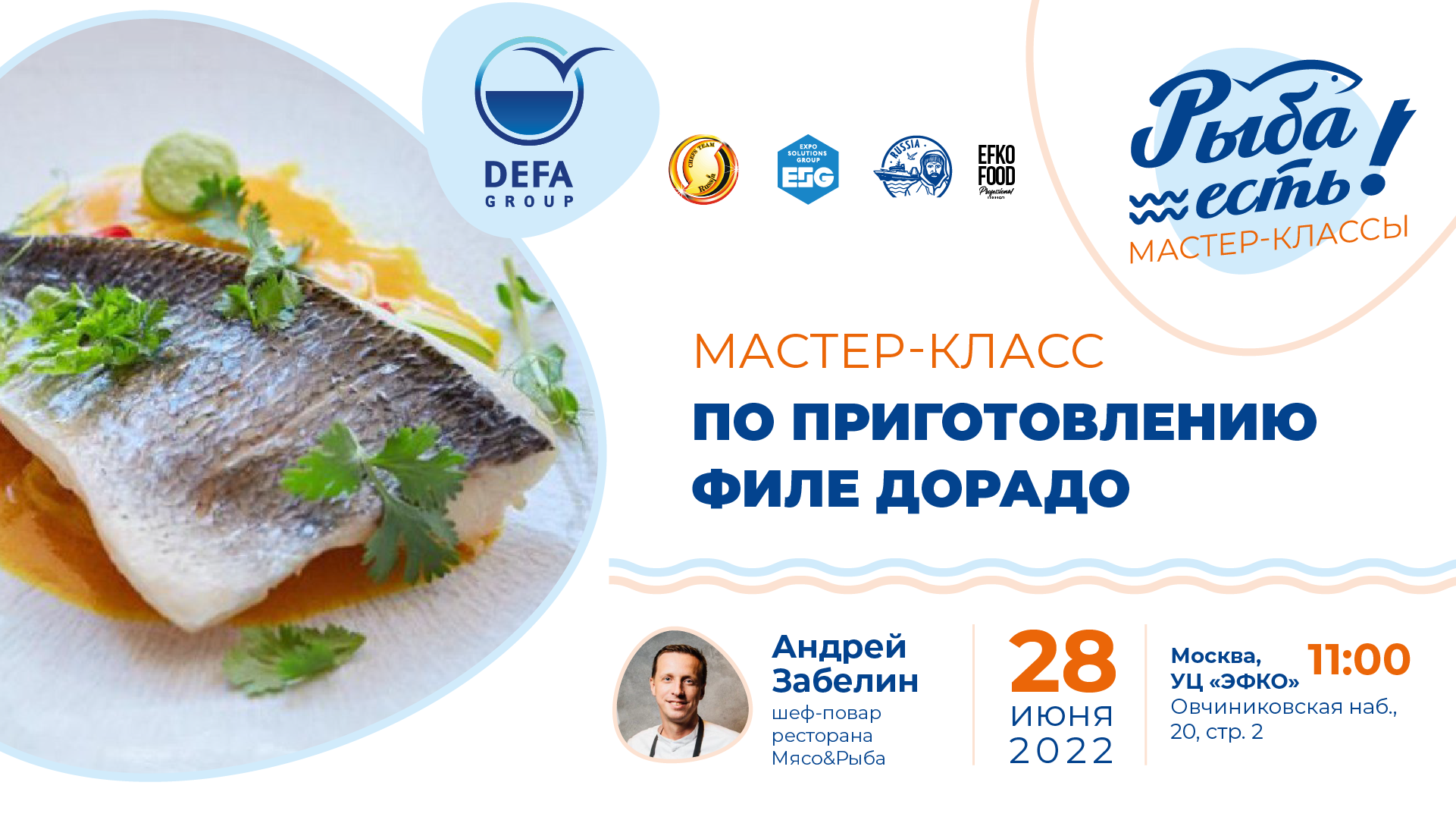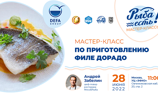 В 13:30, после перерыва, Андрей Забелин, шеф-повар ресторана «Мясо&Рыба», покажет, как готовить филе дорадо из охлаждённого сырья, которое предоставит Defa Group.